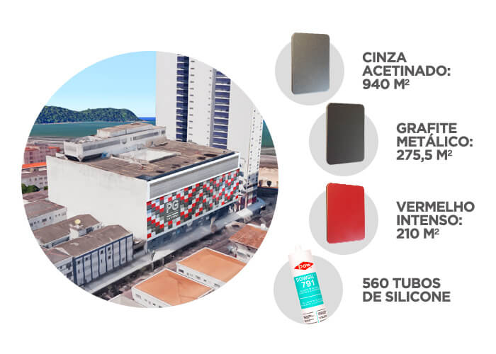 Foram necessários mais de 1400 m² de ACM Tecbond (chapa de alumínio composto) para revestir a nova fachada do PG Praia Grande Shopping. Além de 560 tubos de silicone Dowsil, distribuídos pela Day Brasil, utilizados na junta de dilatação das chapas, o que garante sua preservação e acabamento.